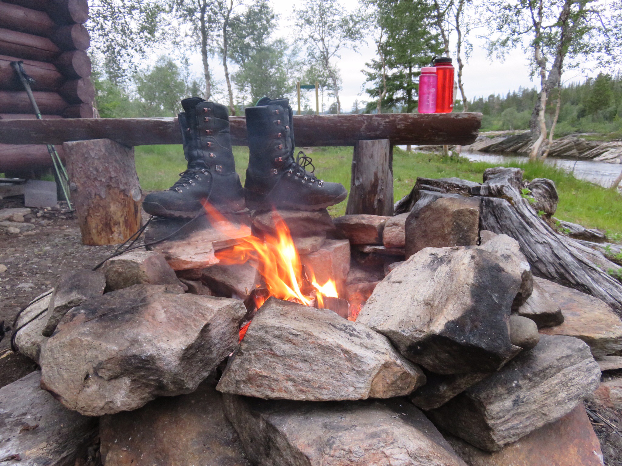 Jeg valgte et par jaktstøvler som er høyere enn vanlige fjellstøvler. Det er godt å ha litt ekstra ankelstøtte på langtur med tung sekk. Det er også praktisk da jeg på første del av turen måtte gå i en del råtten snø, samt vade elver og bekker. Jeg kunne vasse mange bekker med støvlene på uten at vannet gikk over støvelkanten.
